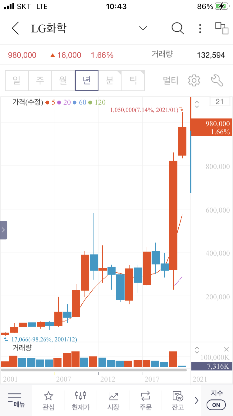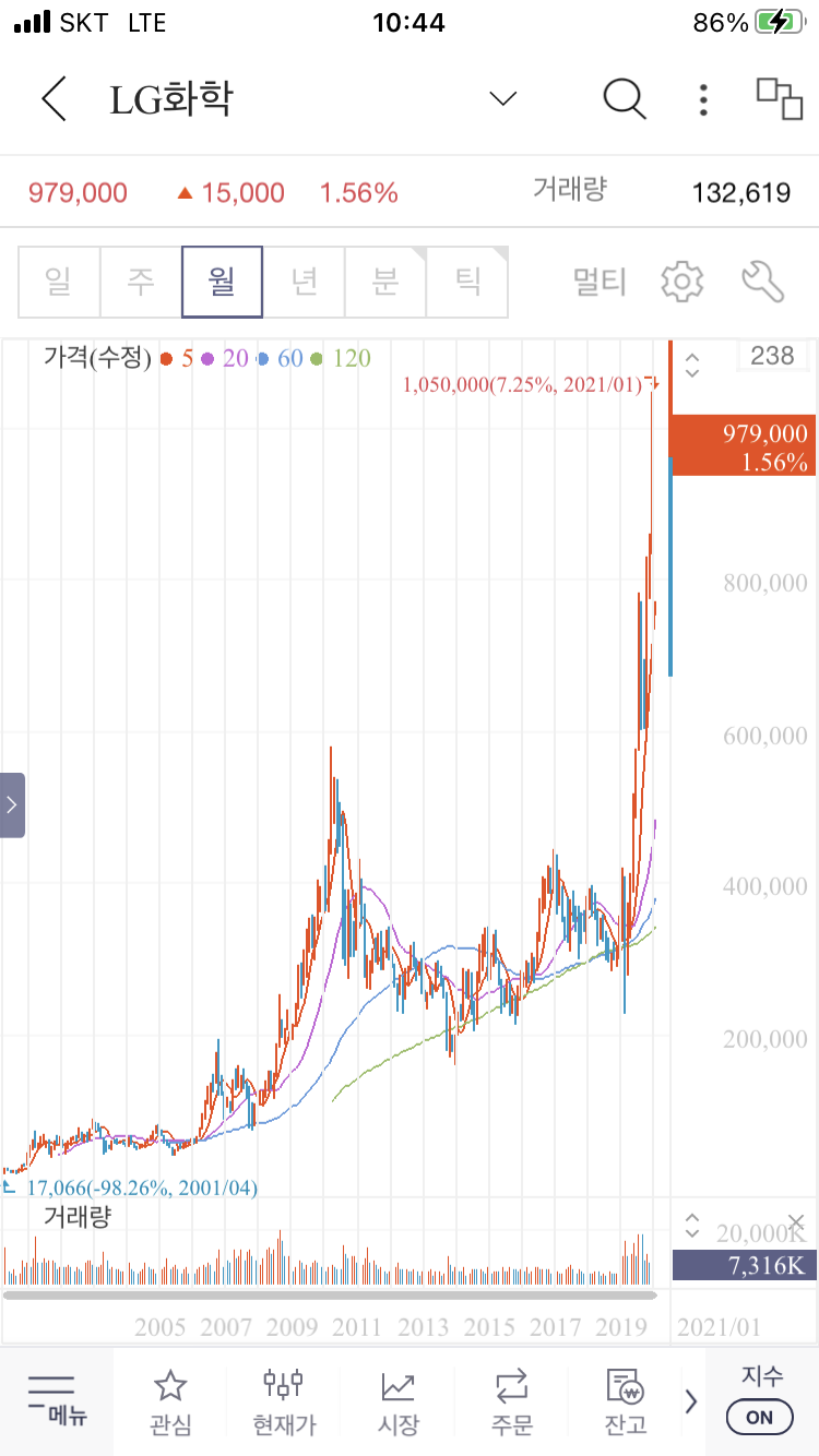 LG화학 연, 월, 주봉 차트