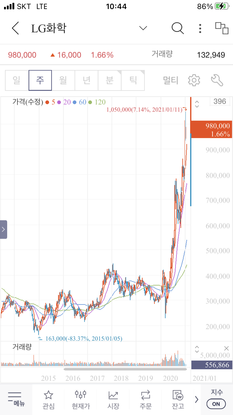 하지만 11월 2일 58만대까지 바닥을 치고 이후 계속해서 상승하여 2021년 1월 8월 100만원을 터치하고 11일 104만 5천원까지 올라간 이후 99만 8천원에 장을 마감, 13일날 드디어 100만원에 장을 마감하였다.