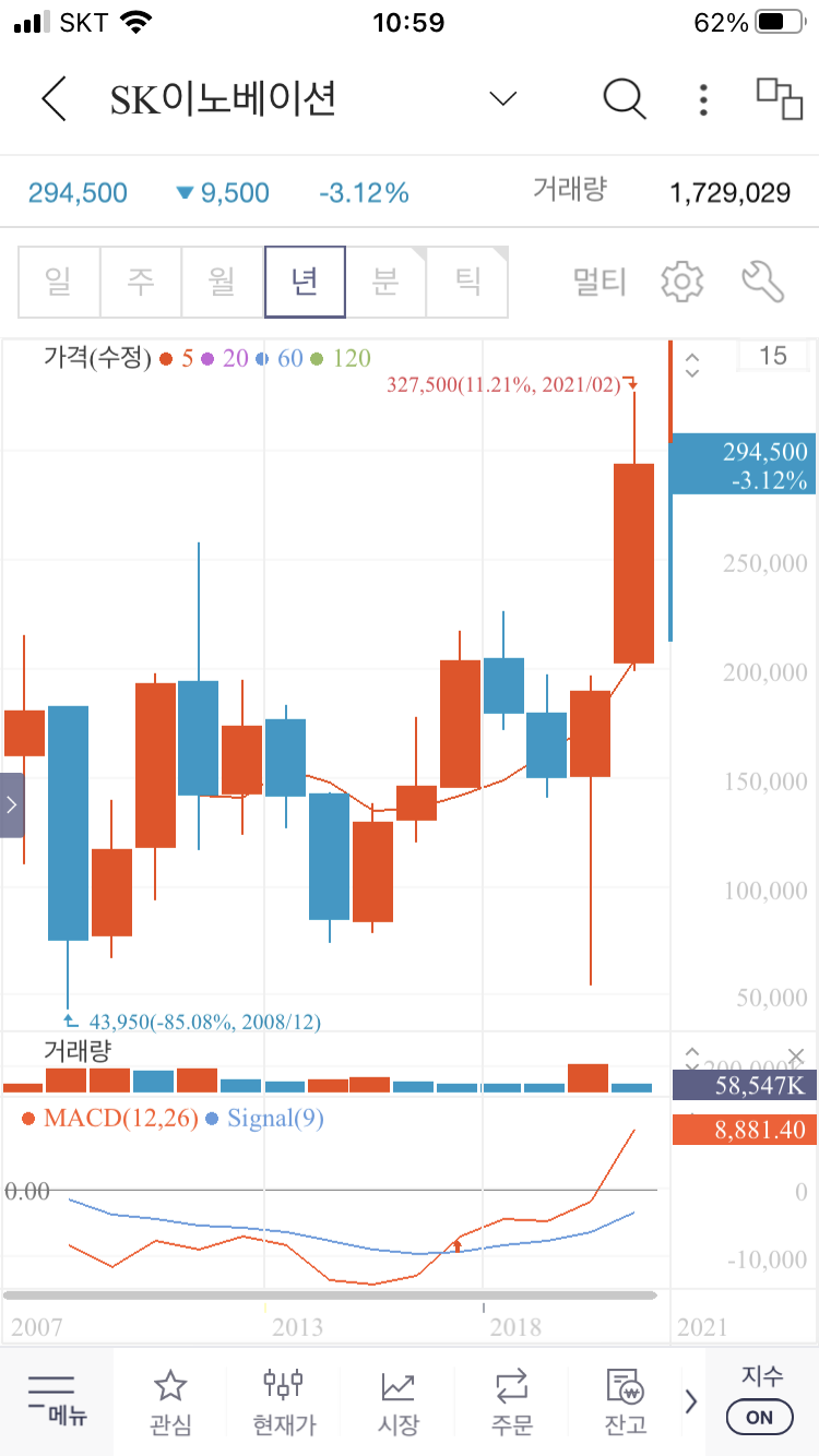 이제 SK이노베이션은 연, 월, 주봉차트를 보겠습니다.