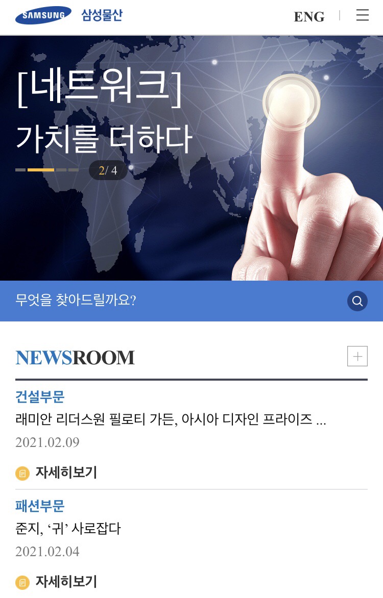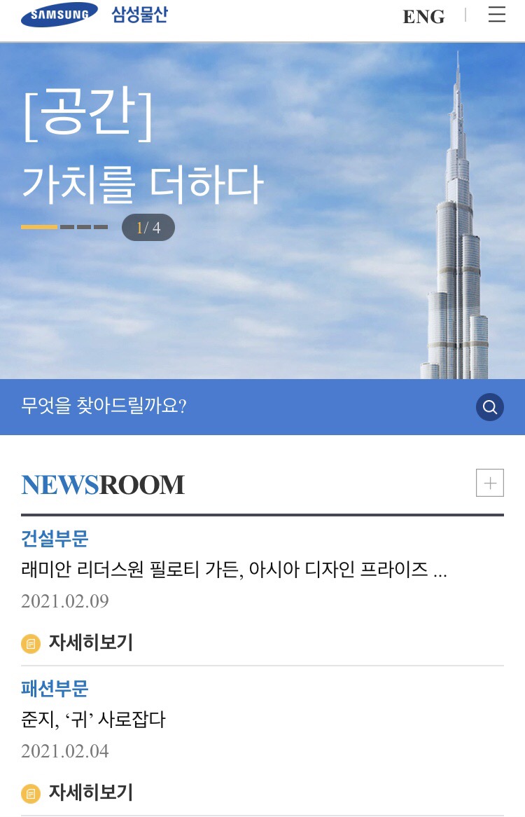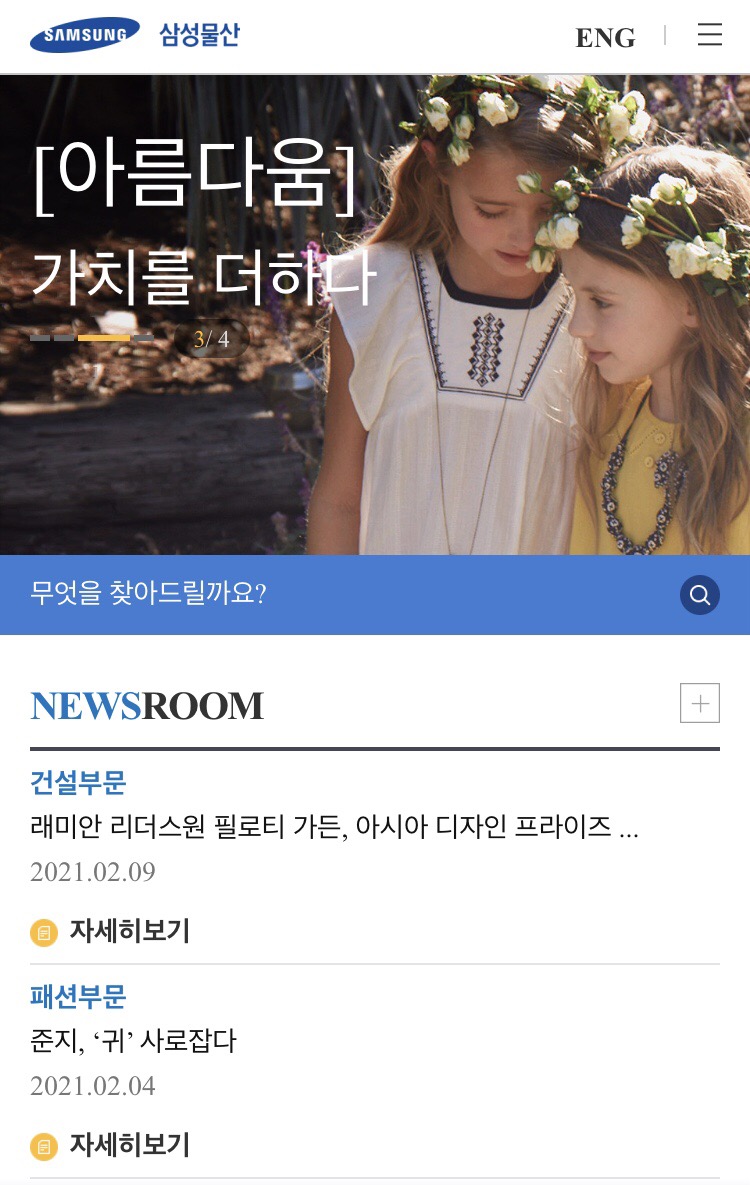 현재 삼성물산의 주력사업은 건설 부문이며, 삼성물산의 래미안은 세계적으로도 유명한 브랜드죠. 요즘은 자이에 뺏긴 것 같지만 살고 싶은 아파트 1위에 항상 랭크되어왔죠. 고급아파트라는 느낌도 갖고 있고 굉장히 좋은 브랜드인 것은 분명한 사실입니다.