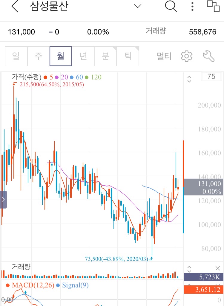 삼성물산의 월봉과 주봉차트 입니다.