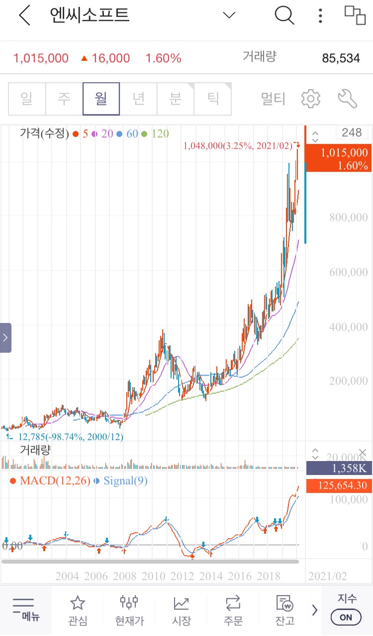 엔씨소프트의 20년 4분기 매출액은 5,613억원이며, 영업이익은 1,567 억 원입니다. 모바일 리니지의 선전등으로 꾸준히 높은 매출액을 보이고 있는 것으로 보입니다. 엔씨소프트는 2월 초 드디어 역사상 최고점인 100만원을 돌파하며, 정말로 미친 주가를 보여주고 있는데요. 오늘도 100만원을 넘은 상태로 장을 마감하였는데요. 최근 나오는 여러 리서치들을 종합해보면 2021년보다는 2022년을 더욱 기대하는 내용이 많습니다. 적정 주가를 대부분의 리서치들에서 적정주가를 130만원이상으로 보고 있고요. 현재보다 30% 이상의 갭이 있는 상승 여력이 있다는 것인데요, 한 가지 불안한 점은 엔씨소프트의 내수 매출과 해외의 매출을 비교해보면 국내 매출이 압도적으로 높으며, 이러한 점이 리스크가 된다고 생각하지만 그러한 부분은 국내에 워낙 충성도 높은 소비자들이 있기 때문인 것 같습니다. 아무튼 2021년 초반 엔씨소프트의 기세는 정말 대단합니다. 앞으로도 충분한 여력을 갖고 있고 국내 최고의 게임회사인 엔씨소프트의 더욱더 밝은 앞날을 기대하며 글을 마치도록 할게요.