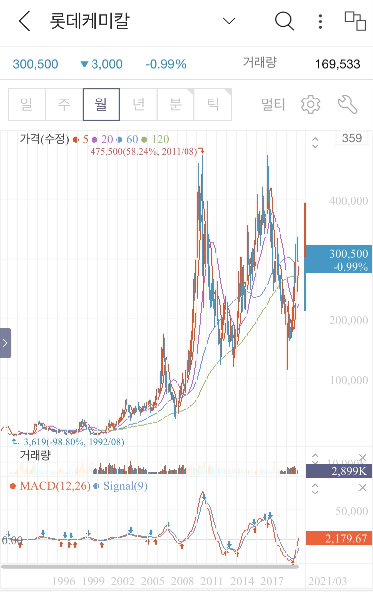 대표적인 경기 민감주인 롯데케미칼의 현재 주가는 30만 원입니다. 얼마 전 신한금융투자는 9일 롯데케미칼의 올 1분기 영업이익이 컨세서스를 상회하고 올해 영업이익은 턴어라운드를 전망했습니다. 목표주가도 38만 5000원에서 45만 원으로 상향 조정하며 매우 긍정적으로 전망하였는데, 이는 OPEC(석유수출국기구)은 세계 경제 전망 개선을 원유 수요 예상치 상향 조정이 그 한 이유가 될 것 같습니다. 아마 백신 보급 등으로 인해 빠른 경제회복이 되면 그 가장 큰 수혜를 입는 회사가 신종 코로나바이러스 감염증(코로나 19) 백신 보급의 확대로 경제 정상화 기대가 큰 상황에서 롯데케미칼은 올해 굉장히 기대되는 회사 중 하나입니다.