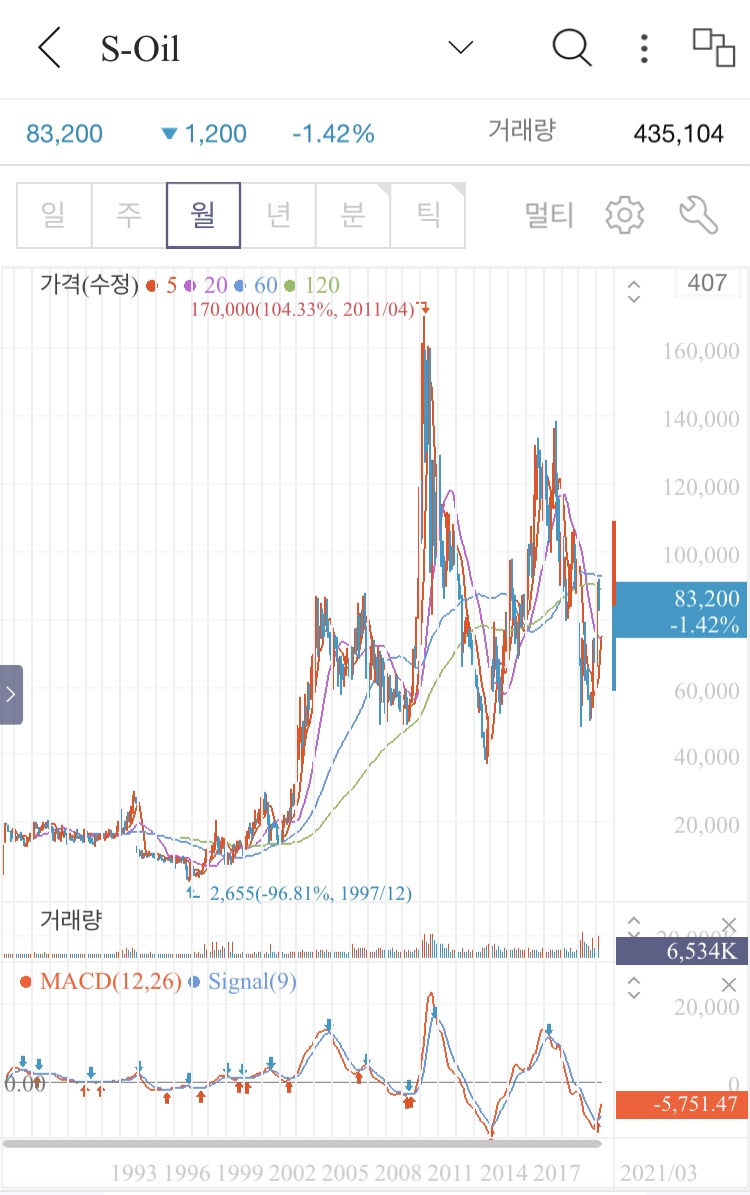 3. S-Oil 월봉, 주봉 차트