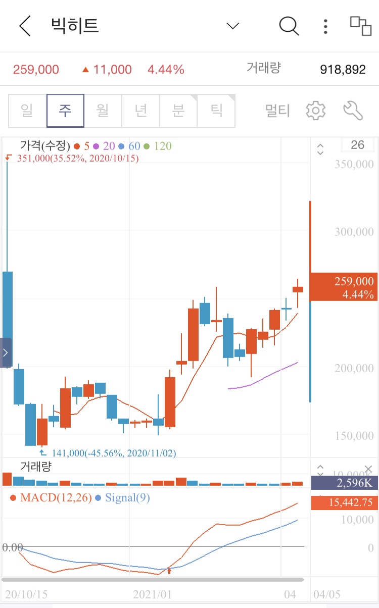 빅히트 월봉, 주봉차트